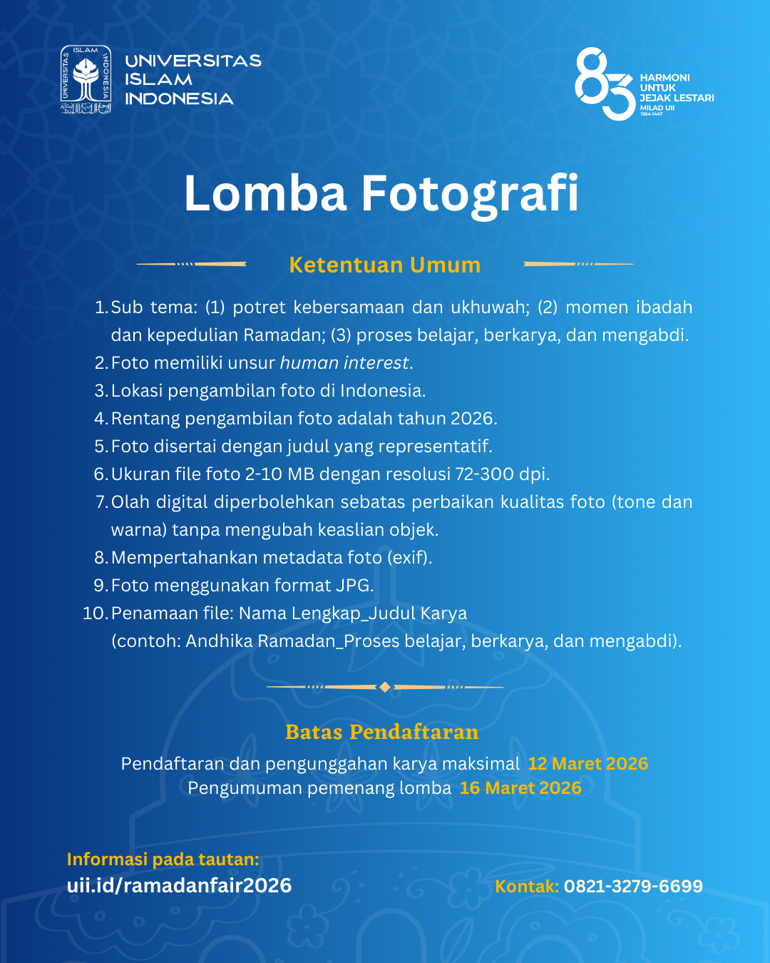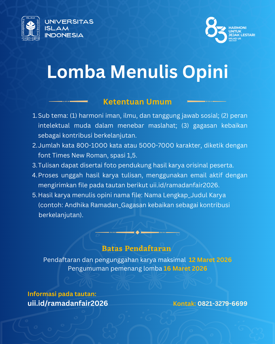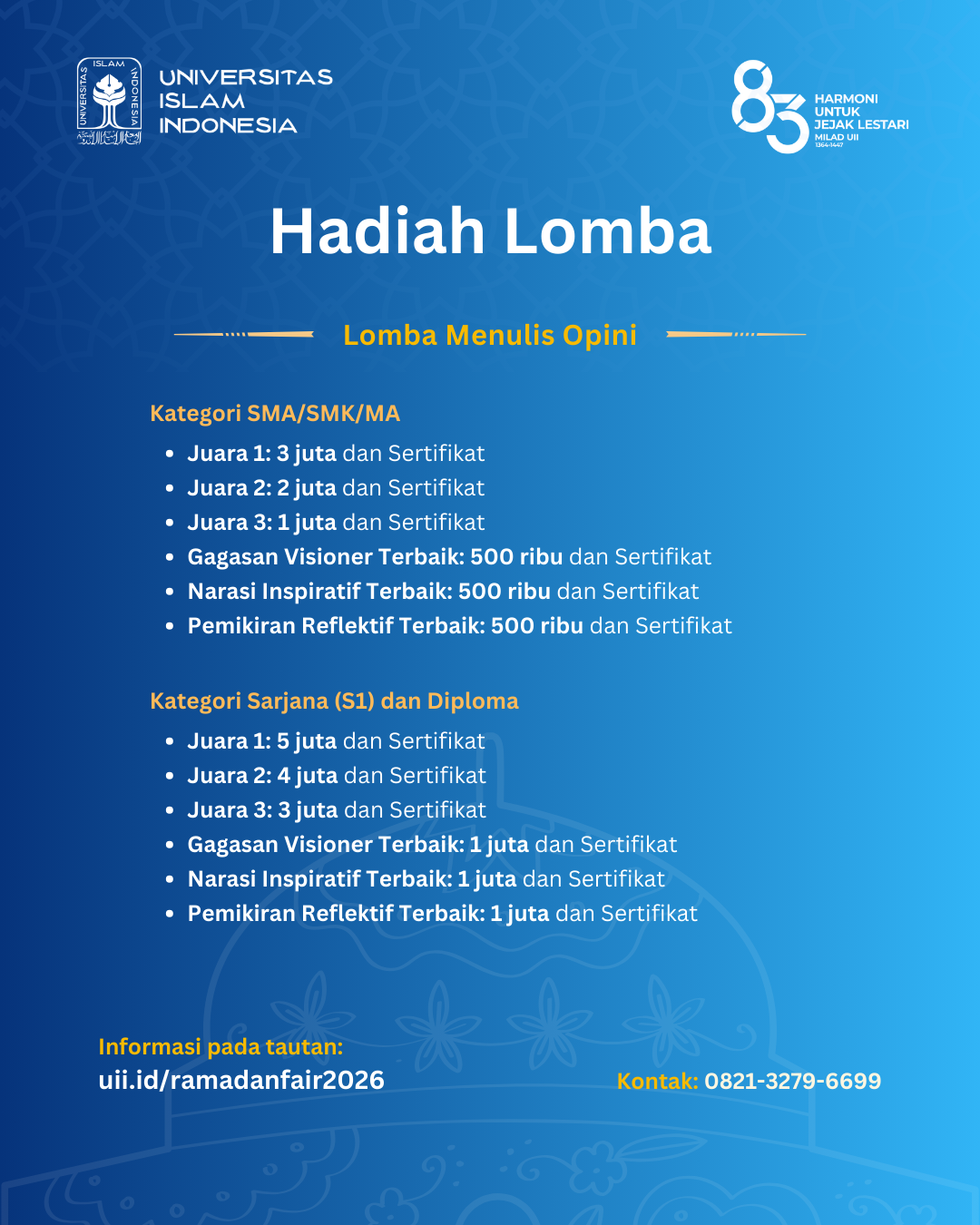 UII Ramadan Fair 2026 merupakan rangkaian kegiatan yang diselenggarakan oleh Universitas Islam Indonesia dalam rangka menyemarakkan bulan suci Ramadan. Mengangkat tema “Merajut Harmoni, Menebar Kebaikan”, kegiatan ini menghadirkan Lomba Fotografi dan Lomba Menulis Opini yang terbuka bagi siswa SMA/SMK/MA sederajat serta mahasiswa Diploma dan Sarjana (S1) di seluruh Indonesia.